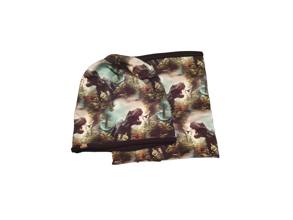 Bavlněná souprava, vnitřní strana fleece: čepice + nákrčník. Pro kluky, ale možná i pro holčičky ve věku zhruba od 3 do 9let. Motiv: Dinosaurus. Materiál: 95% bavlna, 5% elastan. Rozměr, obvod hlavy: 50-54cm, nákrčník: délka - 26cm, šíře - 25cm. Souprava hezky sedí na ouška a je vhodná pro jarní i podzimní období, ale i slabší zimu.
