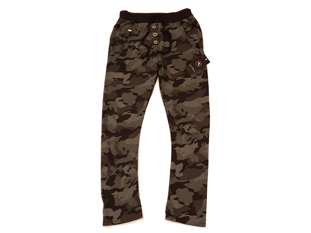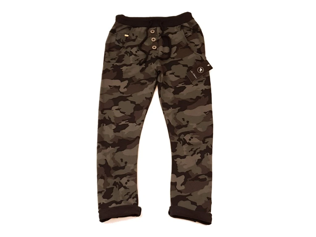 Dámské módní tepláky, dvě boční kapsy, pas do gumy se šňůrkou na stažení, falešný punt + tři knoflíky. Úzký střih v okolí lýtek (30-37cm). Barva: maskáčová - tmavá. Materiál: 95% bavlna, 5% lykra. Vhodné pro běžné i sportovní použití. Univerzální velikost (č.36-38), délka 93cm s možností ohrnutí nohavic, obvod pasu bez natažení 70cm, obvod boků 90cm bez natažení. Doporučujeme prát naruby.