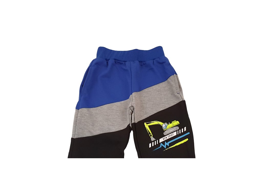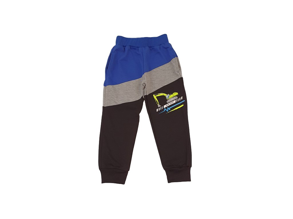 Dětské tepláky s kapsami, v pase do patentu s gumou + nohavice do patentu. Na levé nohavici aplikace - bagr. Materiál: 85% bavlna, 10% polyester, 5% elastan. Doporučujeme prát na ruby.